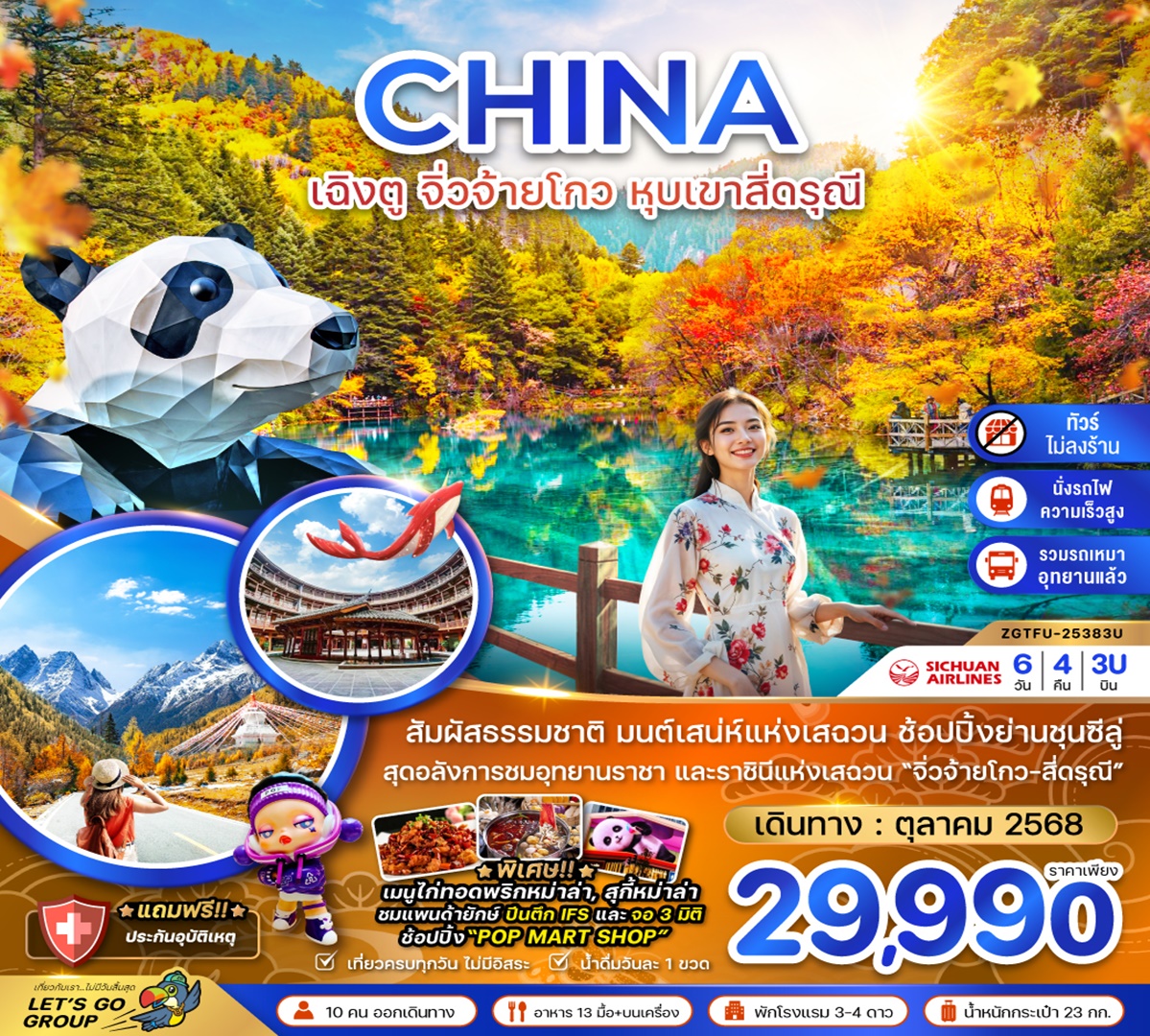 4 เมืองจิ่วจ้ายโกว – อุทยานแห่งชาติจิ่วจ้ายโกว – ทะเลสาบแรด – น้ำตกธารไข่มุก – ทะเลสาบนกยูง – ทะเลสาบแพนด้า – เมืองชวนจู่ชื่อ ไก่ทอด พริกหม่าล่า